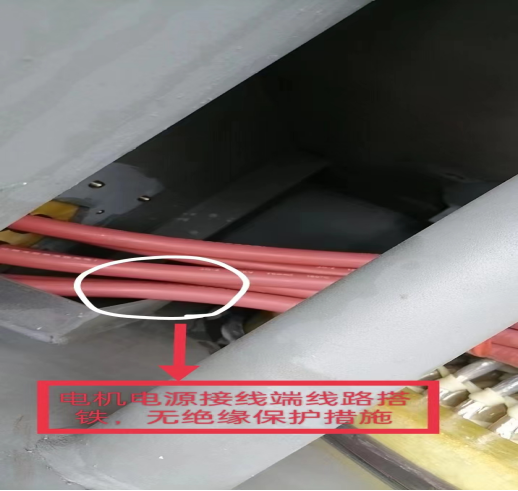 9月8日上午檢修電儀負(fù)責(zé)人周福和互保對(duì)子朱江華正常巡視到球團(tuán)脫硝增壓風(fēng)機(jī)處時(shí),施工人員正準(zhǔn)備對(duì)風(fēng)機(jī)電機(jī)頂部進(jìn)行封蓋。于職業(yè)的本能反應(yīng)兩人快速對(duì)封蓋前的風(fēng)機(jī)電機(jī)內(nèi)部進(jìn)行最后一次安全檢查,檢查發(fā)現(xiàn)風(fēng)機(jī)內(nèi)部?jī)商幹卮笤O(shè)備安全隱患。第一、高壓電機(jī)電源端線路直接緊靠在金屬棱角邊緣,風(fēng)機(jī)電機(jī)屬于高壓大功率設(shè)備,在運(yùn)行中受到煙氣流量流速,壓力喘振等因素會(huì)產(chǎn)生振動(dòng),如果電源線不進(jìn)行絕緣處理長(zhǎng)時(shí)間運(yùn)行,會(huì)導(dǎo)致絕緣外皮破損產(chǎn)生搭鐵短路放炮事故。