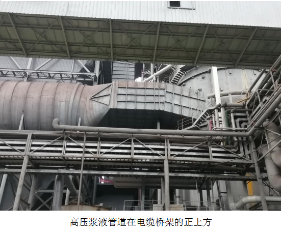 西昌藍(lán)鼎超低排放項(xiàng)目的電纜橋架和漿液管道同在一個(gè)門(mén)型鋼架上,而且高壓漿液管道處于電纜橋架的正上方,一旦發(fā)生高壓管道爆裂,高壓溶液噴射到電纜上,有可能會(huì)造成電纜沖破皮產(chǎn)生短路放炮事故。